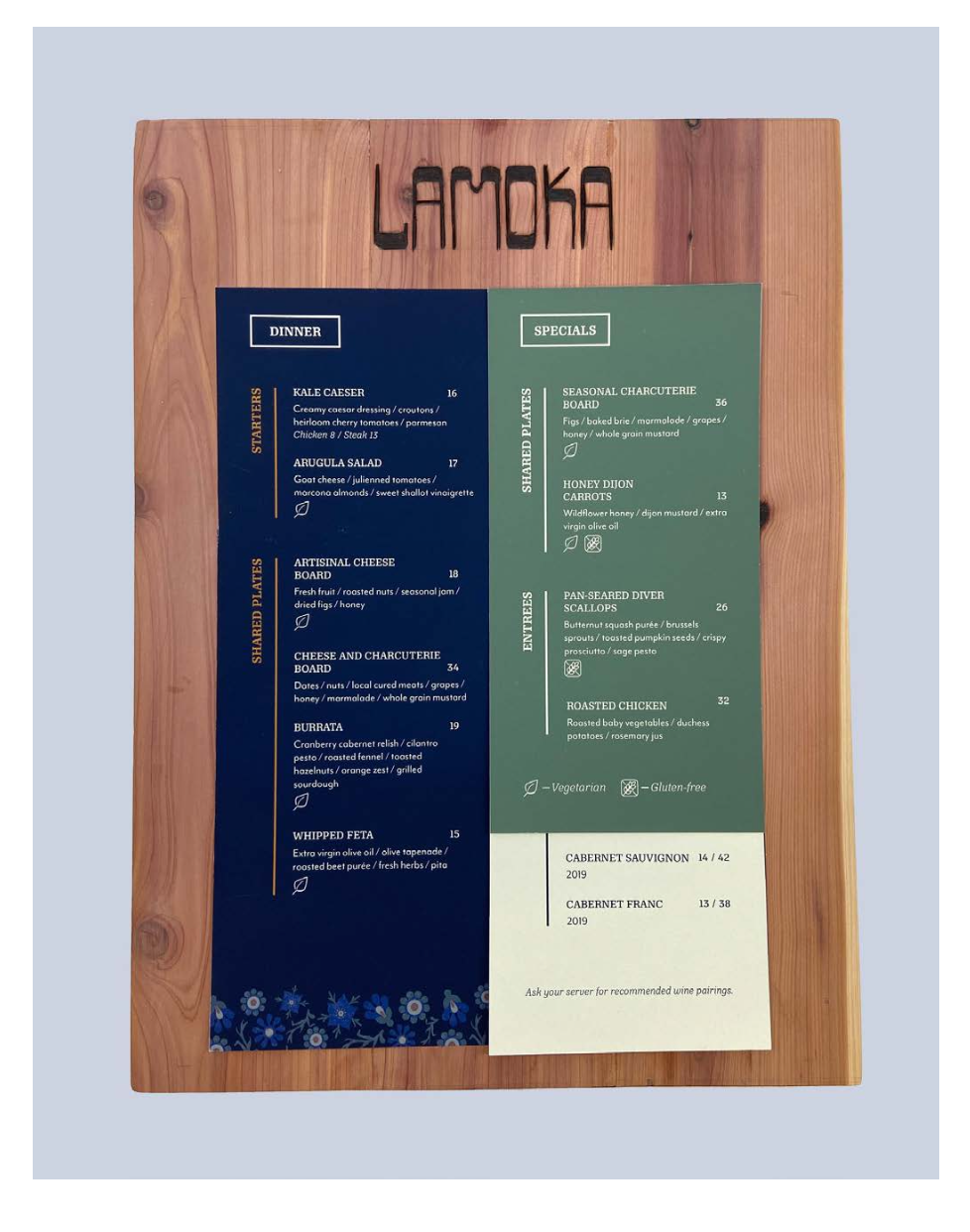 The Lamoka Winery and Restaurant is a brand identity for an enchanting vineyard escape upstate. To complete my vision for the brand, I created built items, digital assets, paper pieces, interior and exterior concepts, a graphic wayfinding system, and illustration.