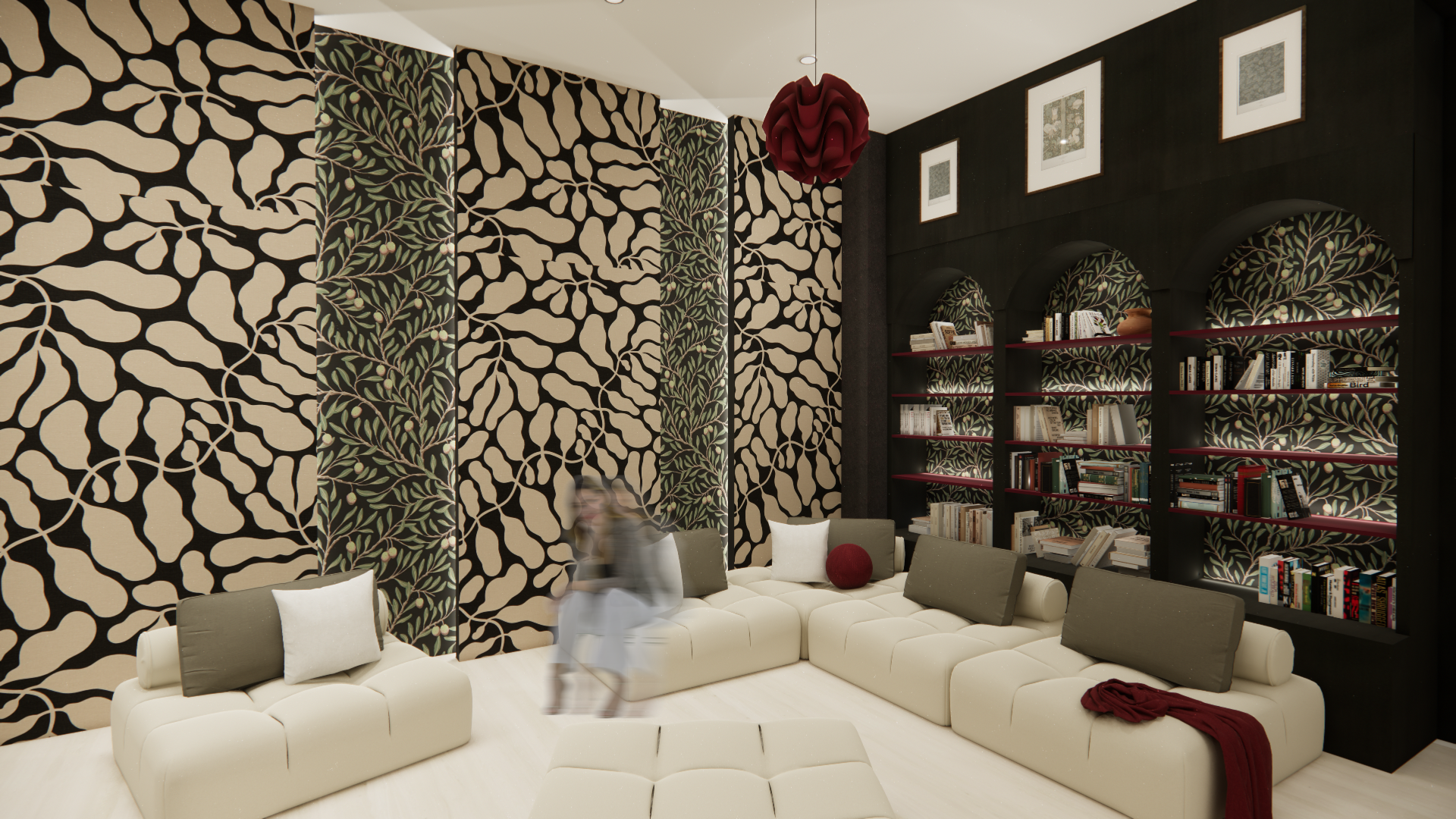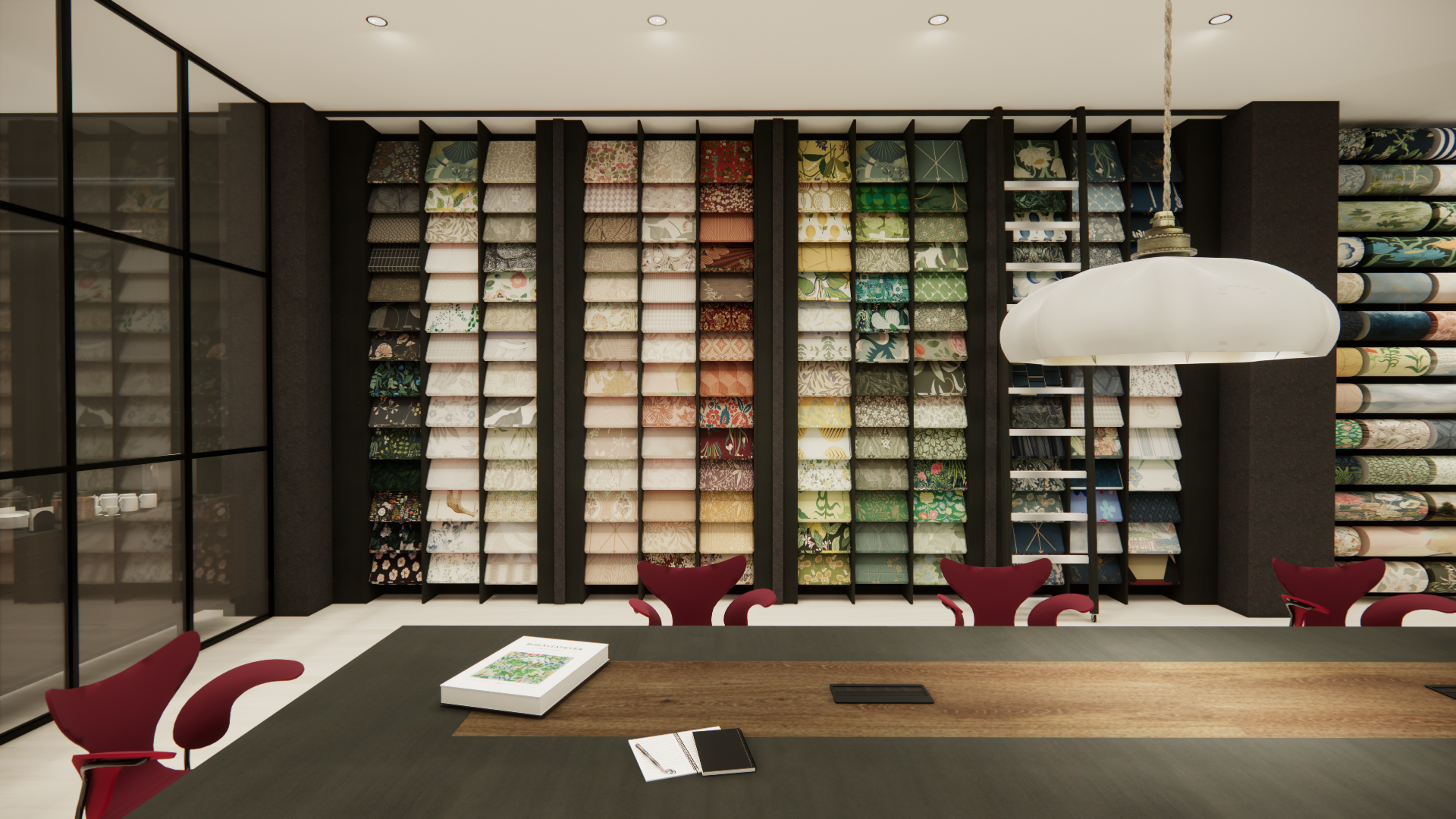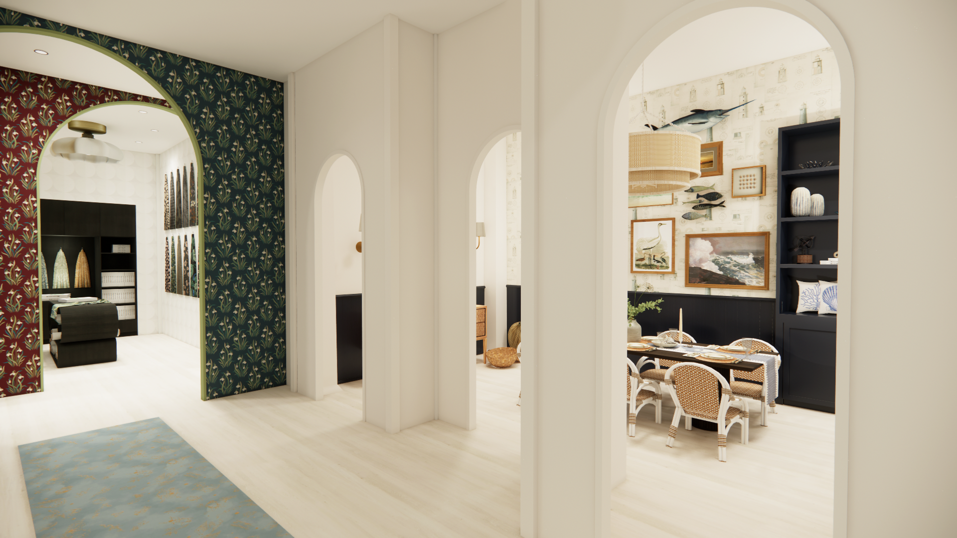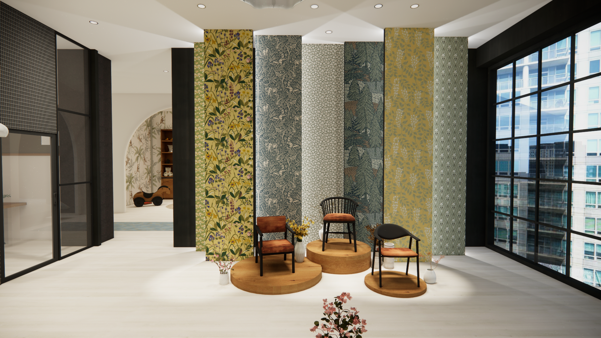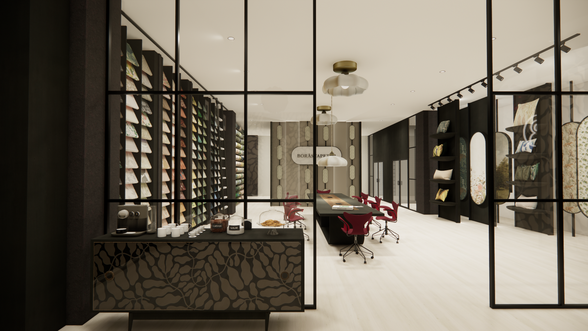 With this project, I used rendering software to build a NYC showroom for a Swedish textile brand. Most of the built-ins and furniture were made custom to best showcase the featured products. To best build the space, I payed careful attention to lighting, scale, and dynamic interaction of texture.